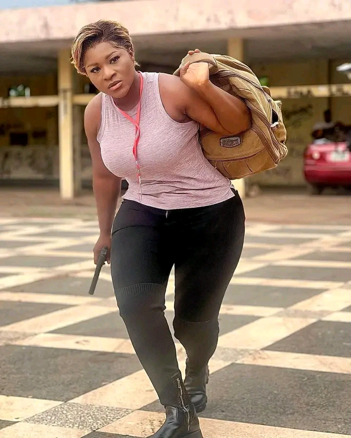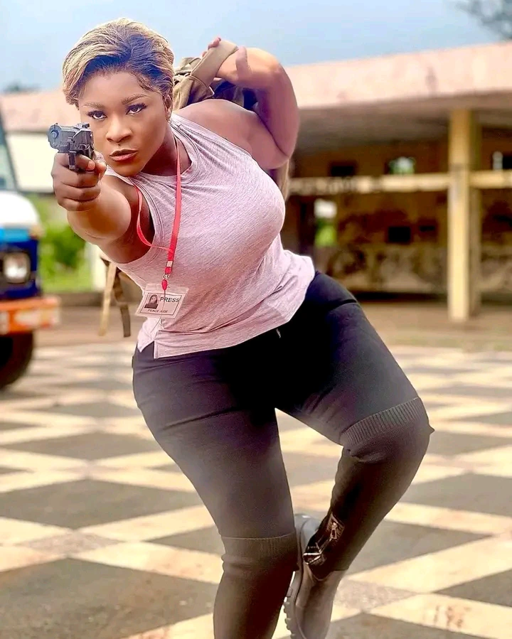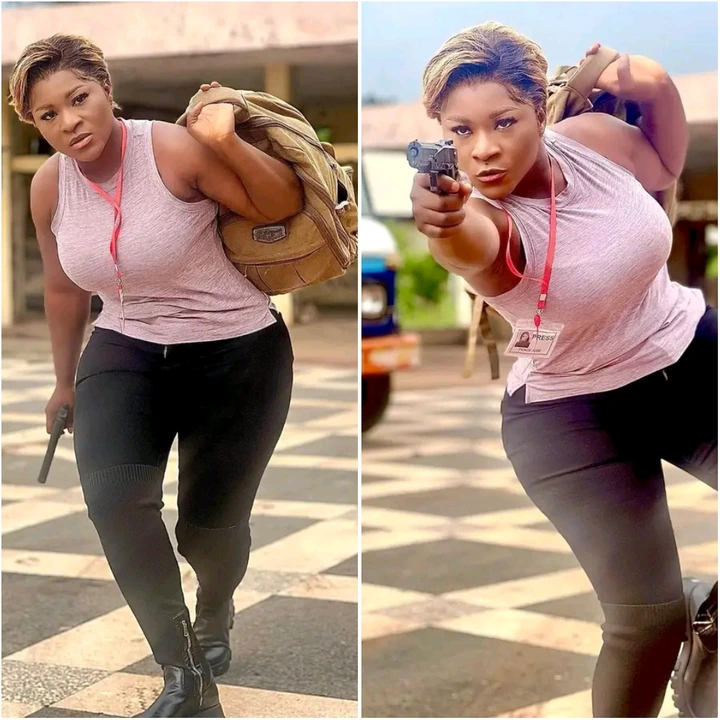 A few hours ago, the popular actress took to her official Facebook page to share some photos of herself from a movie shoot online. In the photos she shared, she was looking so tough as she could be seen holding a bag and a gun.