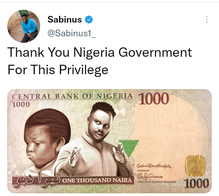 This tweet from Oga Sabinus sharing his photo and Pawpaw on 1000 Naira note has attracted reactions from fans and social media users, as some have find it very funny while some have called it cruise spending.