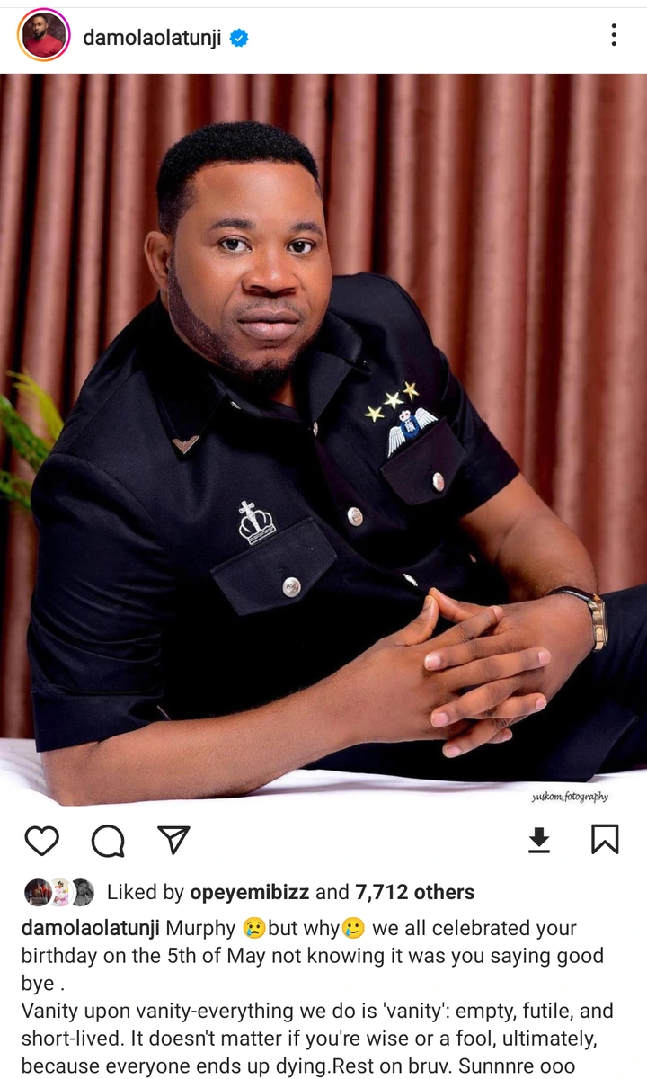 Popular Yoruba movie actor, Damola Olatunji has used his most recent Instagram post to announce the death of his friend and movie colleague, Murphy Afolabi. He took to his Instagram page to share the post, where he revealed that everything we do is vanity upon vanity.
