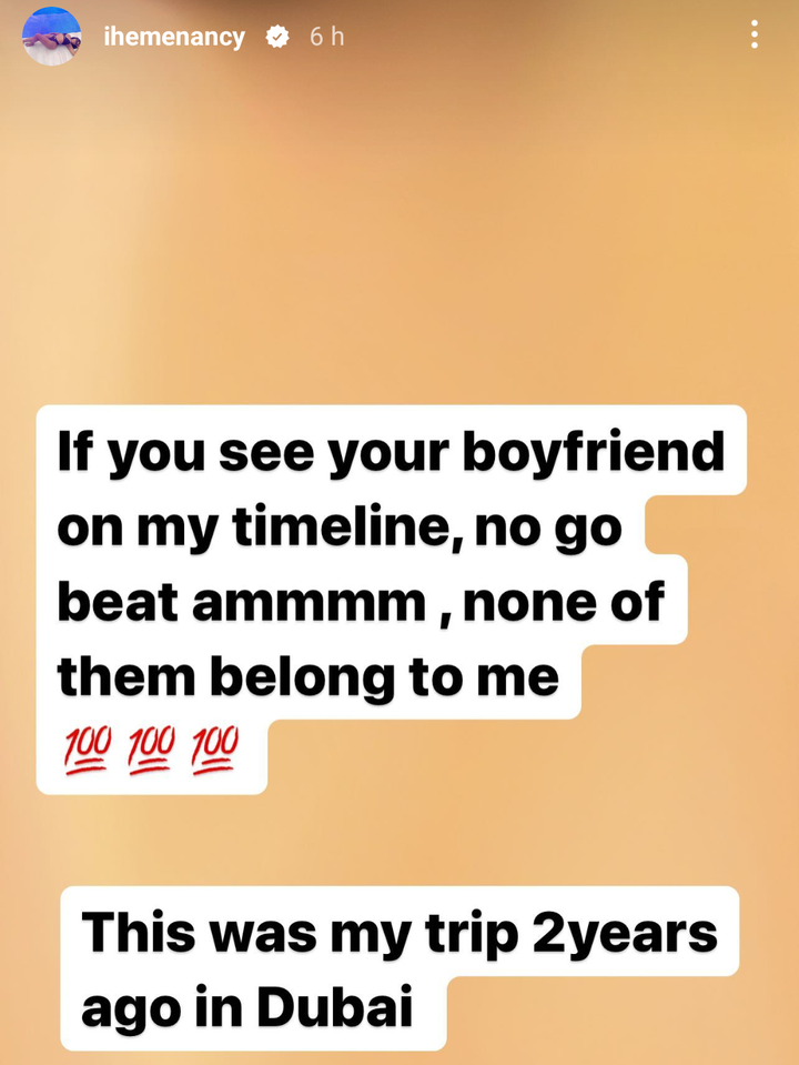 In the statement she made on her Instagram story, she said, "If you see your boyfriend on my timeline, don't beat him, none of them belong to me. This was my trip two years ago to Dubai."