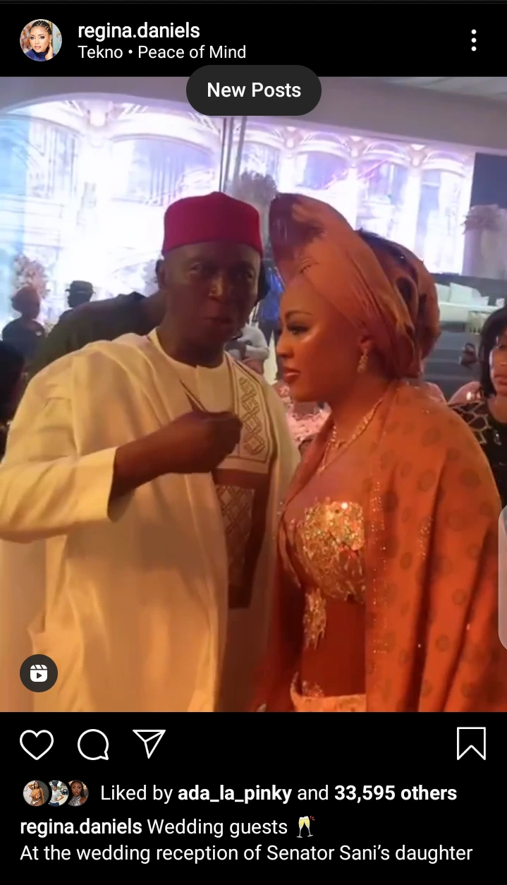 Following the wedding ceremony of the daughter of Nigerian Senator representing the Niger East Senatorial District, Musa Sani, Zainab, Nollywood popular actress, Regina Daniels has taken to social media to upload lovely pictures and a video showing the moment she was present at the event with her husband, Ned Nwoko.