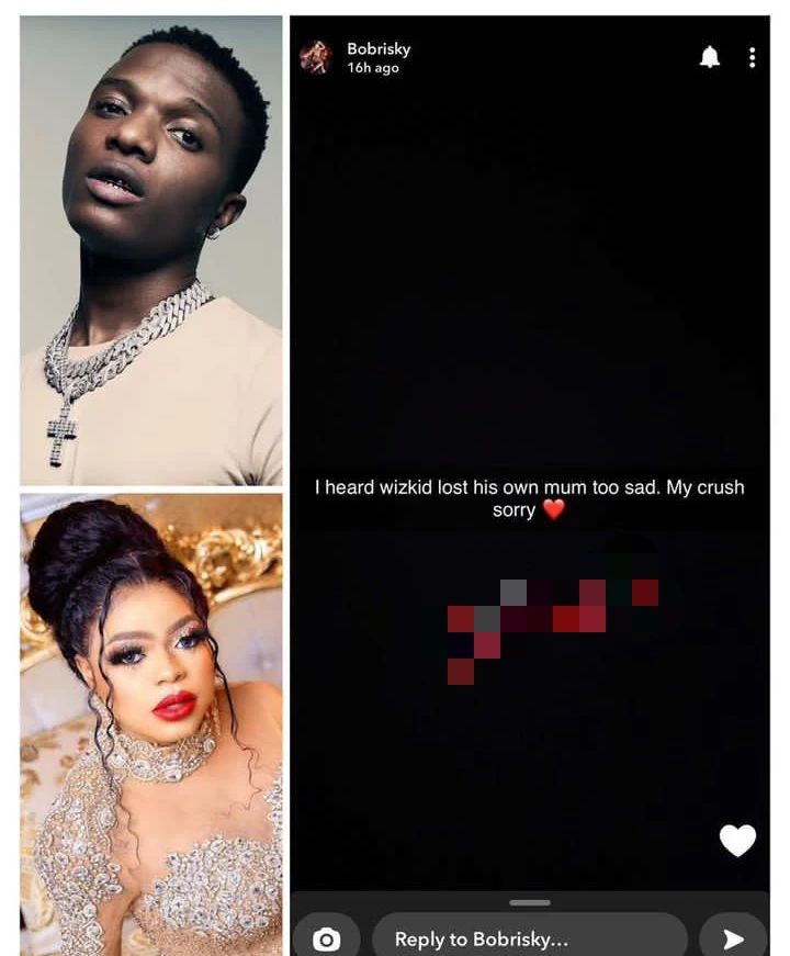 Bobrisky took to his snap chat account and said I heard Wizkid lost his own mum, too sad. Sorry my crush, he said. What are your thoughts on this? Drop what you think about what Bobrisky said below.