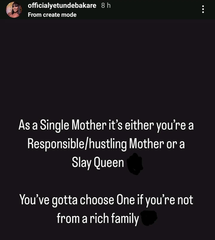 In my opinion, I totally agree with Yetunde Bakare and I think most single mothers should prefer being a responsible mother than a slay queen.